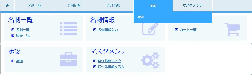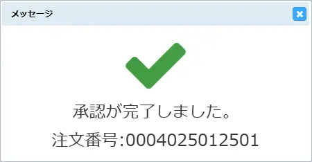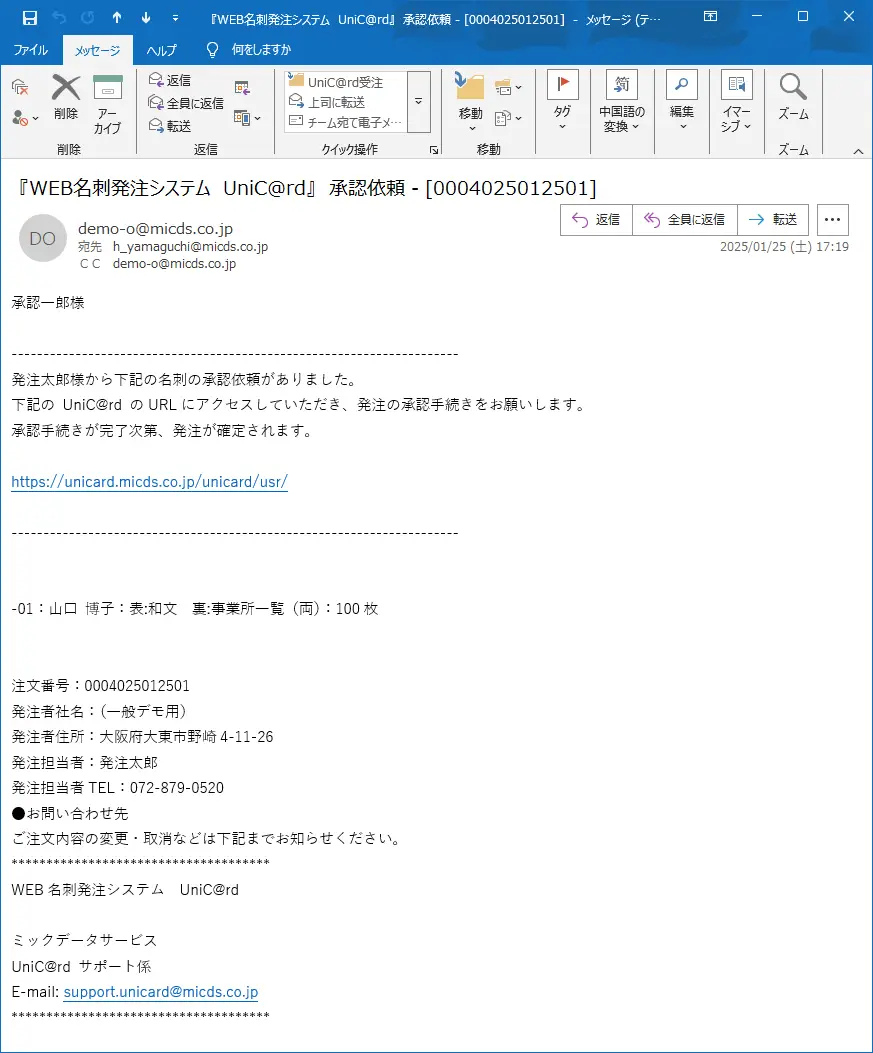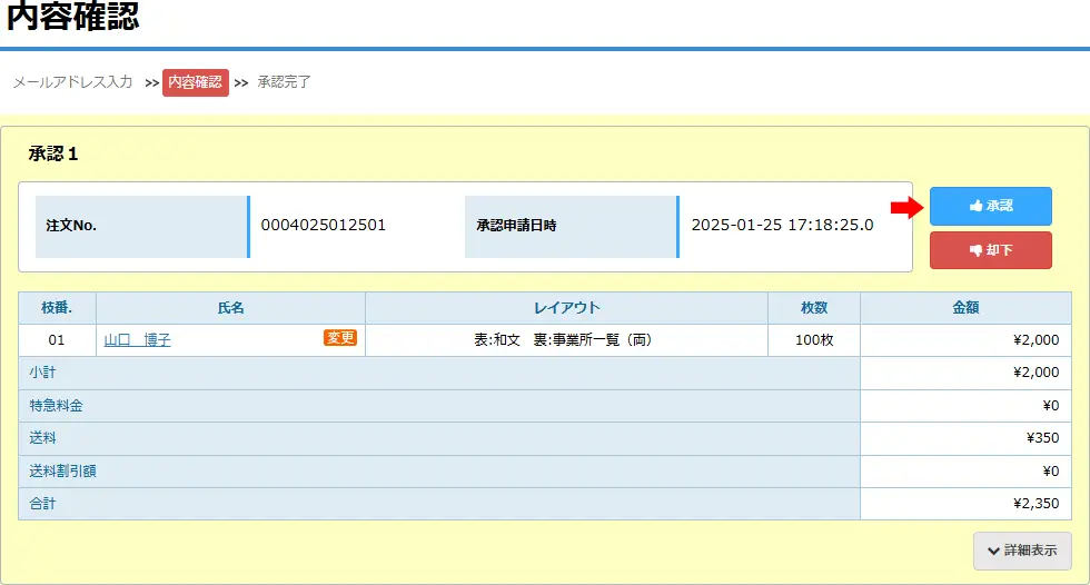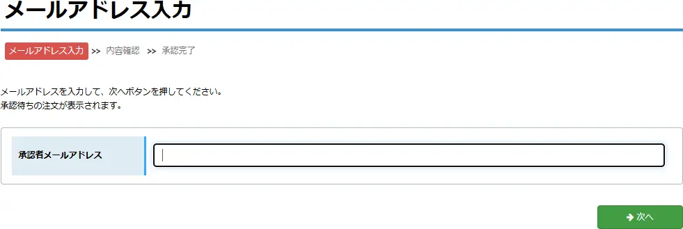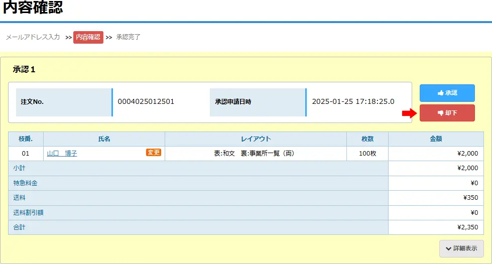 第3章 承認 承認の手順を説明します。❶名刺の承認申請が発注者から承認者にメールで届きます。 ❷承認する人は承認者権限でユニカードにログインします。 ❸メニューバーの承認>承認を指定します。 ❹承認者のメールアドレスを入力して【次へ】をクリックします。 ❺-1 承認画面が表示されますので【承認】をクリックします。 ❺-2 承認しない(承認却下)場合は【却下】をクリックします。 【却下】をクリックすると却下理由を入力する画面が表示されますので必要事項を入力して《却下》をクリックします。※却下理由を添えて発注者に却下通知メールが配信されます。 却下すると注文は取り消しになり、名刺一覧の状態に「承認却下」と表示されます。 ❻次の表示がでたら承認完了です。承認完了後に名刺一覧で「出荷予定日」を確認できます。