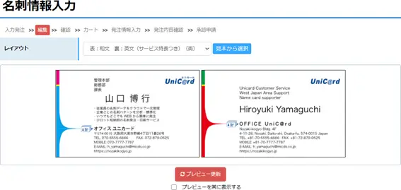 名刺の部署、役職、電話番号、E-mailなどのデータ入力・修正・削除はお客様が行い、画面に表示されるプレビュー確認して発注する事といたします。